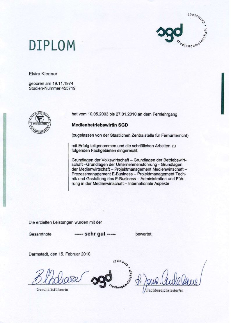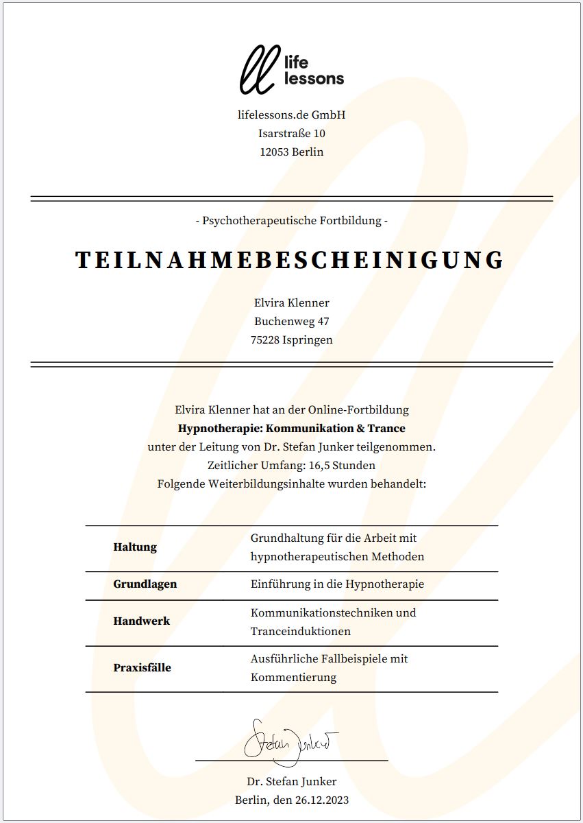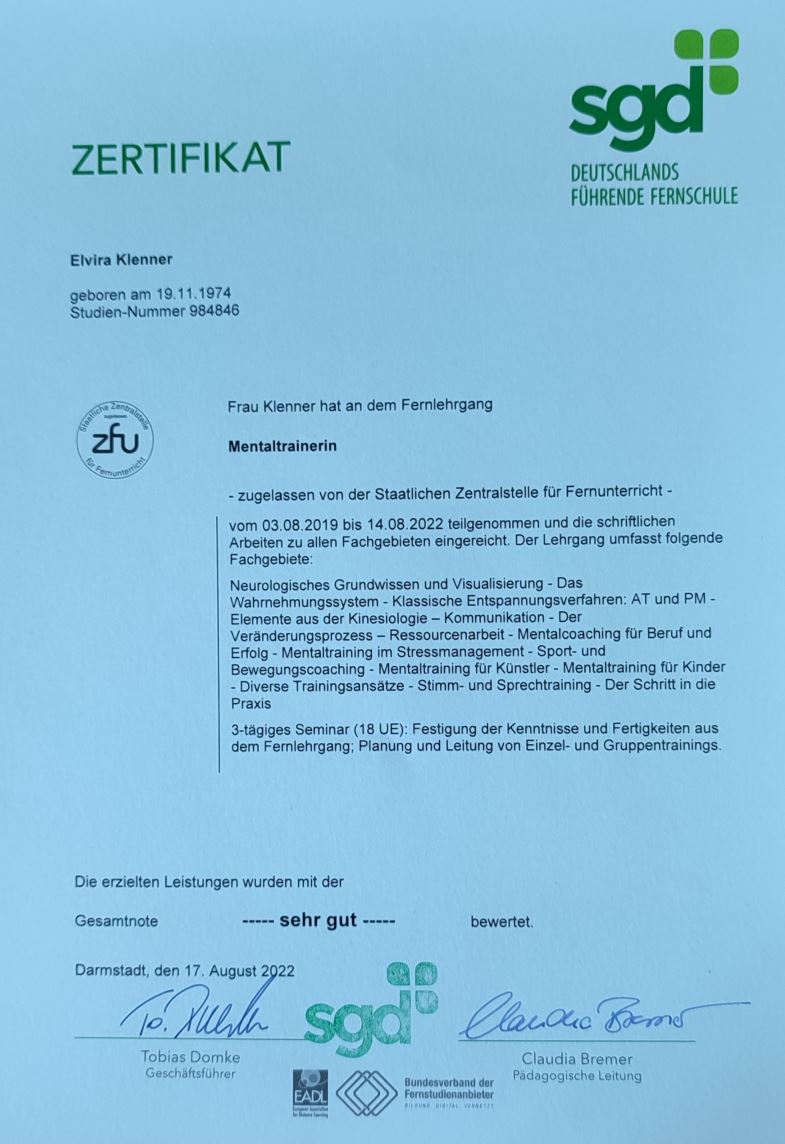 Mein Name ist Elvira Klenner. Ich bin zertifizierte Mentaltrainerin, Hypnose-Coach, Scrum Master, Dipl.-Medienbetriebswirtin und Fremdsprachensekretärin. Außerdem bin ich Ehefrau, Mutter und arbeite seit ca. 30 Jahren als Geschäftsführungsassistentin. Im Jahr 2022 schloß ich das Studium zur Mentaltrainerin erfolgreich ab und gebe seitdem Seminare im Bereich Kommunikation, Stressmanagement, Work-Life-Balance und Achtsamkeit sowie Einzelcoachings.